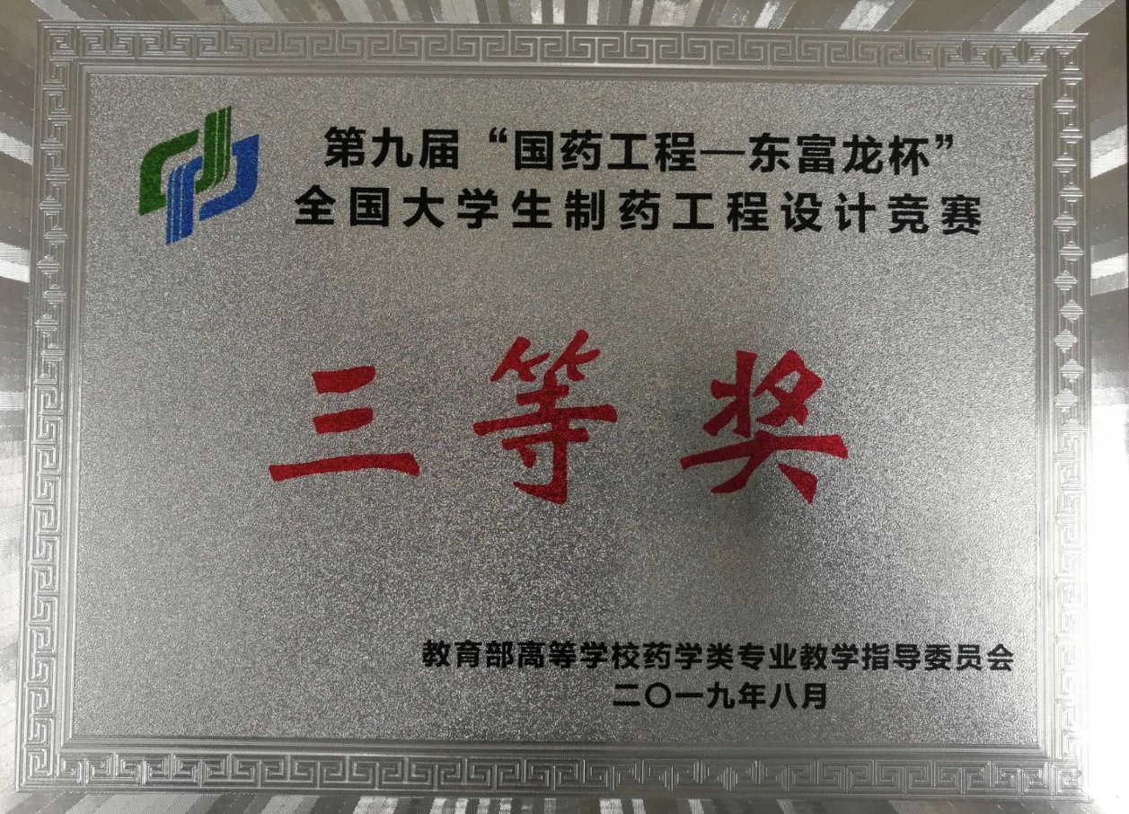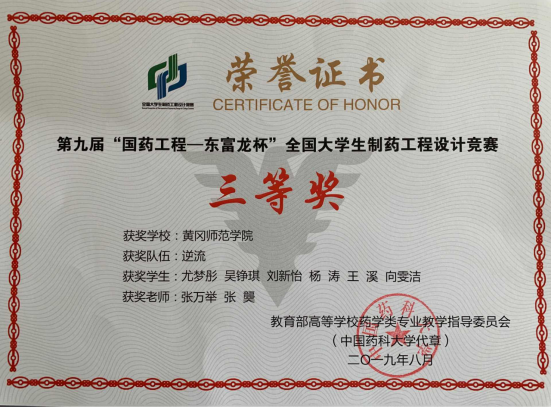 由教育部高等学校药学类专业教学指导委员会主办、中国医药集团联合工程有限公司与上海东富龙科技股份有限公司共同协办、浙江大学承办的第九届“国药工程-东富龙杯”全国大学生制药工程设计竞赛在杭州举行。我校WilliamHill威廉张万举、张龑两位老师指导,制药工程专业学生尤梦彤、吴峥琪、刘新怡、杨涛、王溪、向雯洁组成的“逆流队”代表我校参赛,获得全国三等奖。