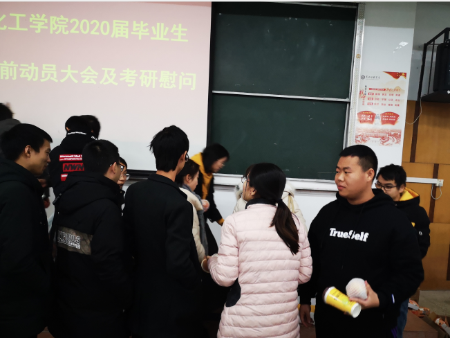 动员大会结束后,我院老师们为考研学子悉心准备了一些慰问品,并以此鼓励大家。面对老师们的期待,我院考研学子重振旗鼓,精神面貌焕然一新。考研学子们一致表示将以饱满的精神状态迎接考试。