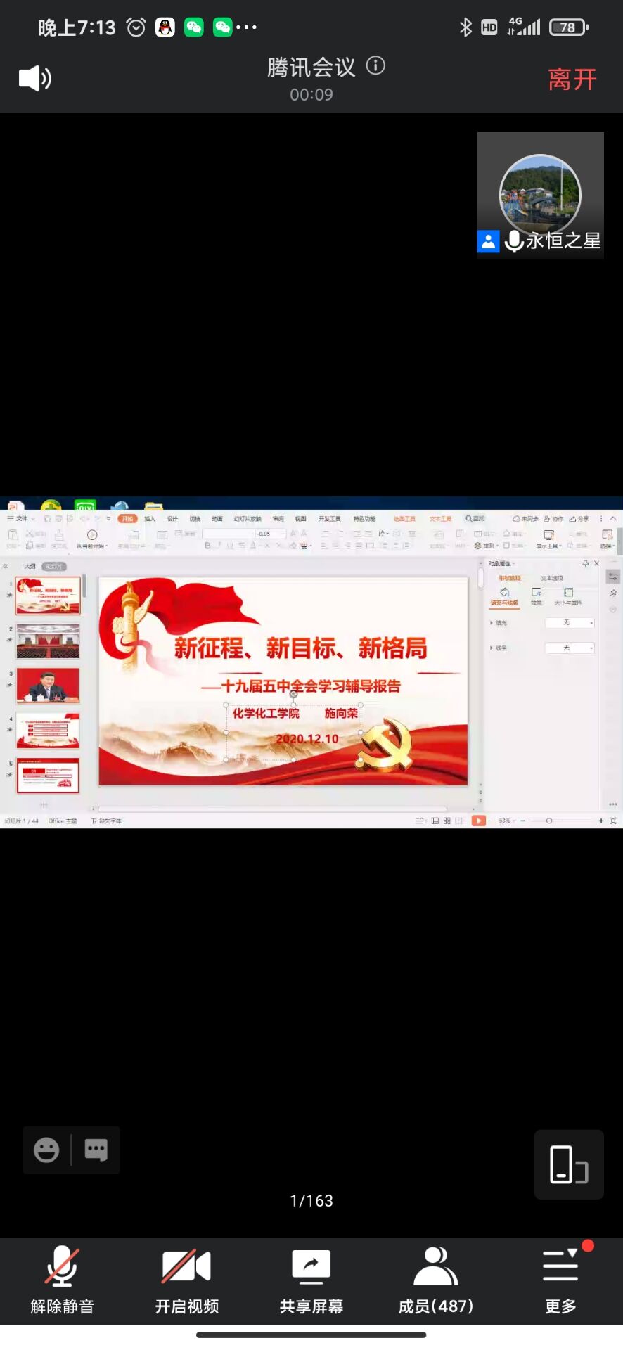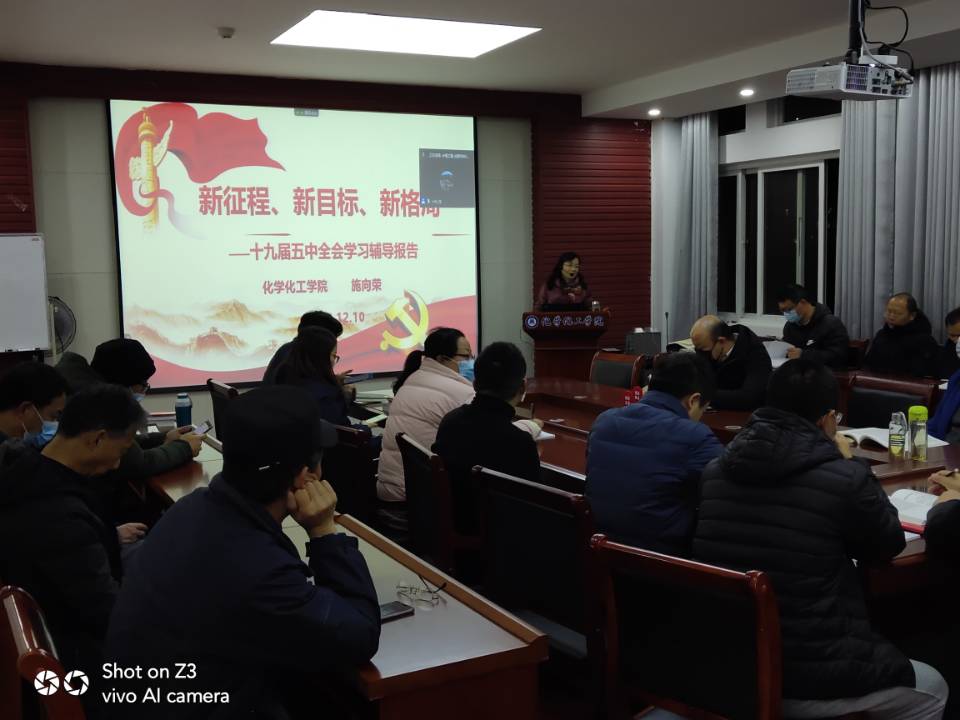 根据学院工作安排,12月10日晚上7点,我院为了加强全院师生贯彻理解党的十九届五中全会精神,党总支书记施向荣为全院师生作宣讲报告,学院班子成员及全体教师50余人在化学楼407参加学习,为做好疫情防控,学生同时通过腾讯会议直播参加了学习。