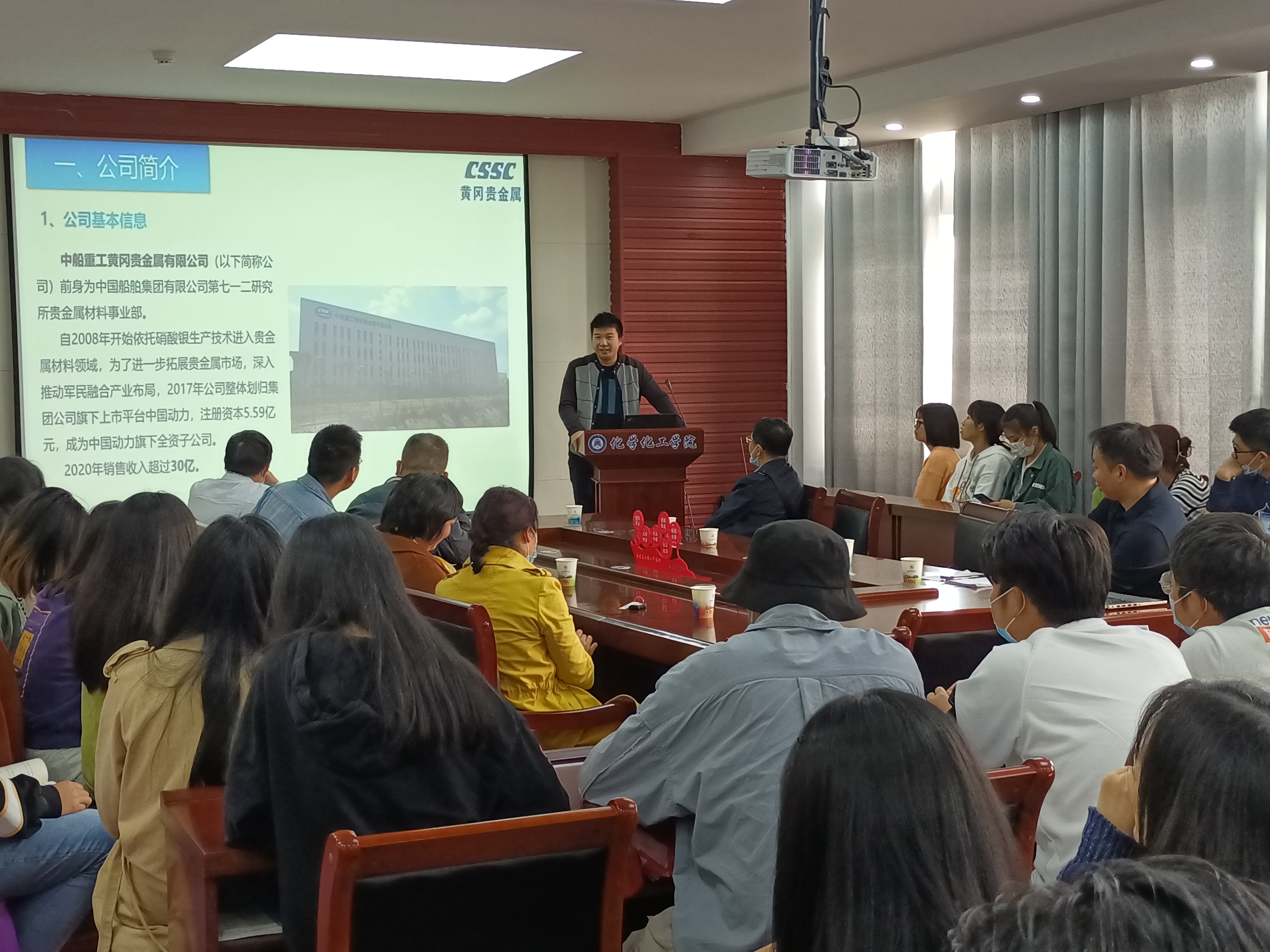 参加此次招聘会的共有8家公司, 分别是黄冈市楚雄化工股份有限公司、中船重工黄冈贵金属有限公司、武汉清江化工黄冈有限公司、湖北昱泓高新材料科技有限公司、江苏凯伦建材股份有限公司、湖北绿宇环保有限公司、通鼎公司,各公司都以ppt的形式对规章制度,福利待遇,企业文化,现有产业结构,组织构架,人力资源政策等方面向同学们做了简单介绍,并现场解答同学们的疑问,各公司都诚挚地邀请我院毕业生加入,为公司注入新鲜的血液。