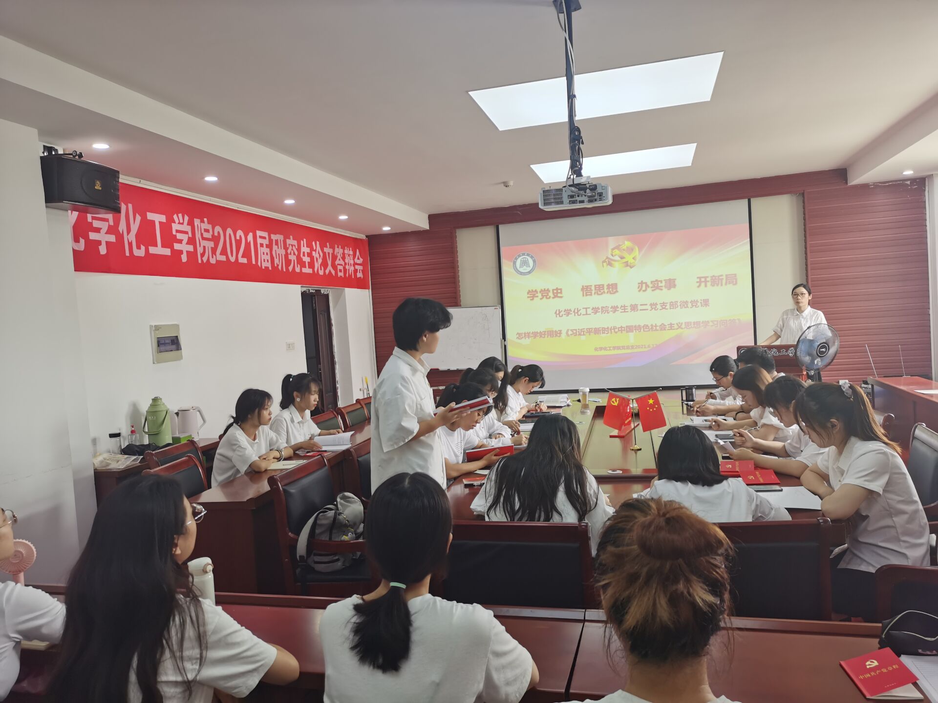 学生第二党支部书记余杨讲述微党课题为:“怎样学好用好《习近平新时代中国特色社会主义思想学习问答》”,详细讲述了就如何准确把握党的创新理论的指导地位、深入理解党的创新理论的科学内涵,及如何学好用好《问答》,将理论成果指导新实践。