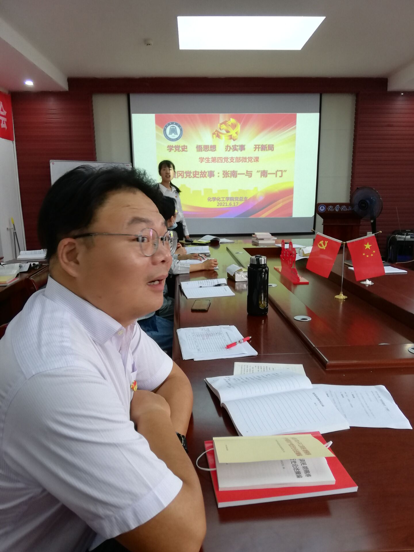 学生第四党支部书记黄小花讲述微党课题为:《黄冈党史故事张南一与南一门》,讲述了中国共产党的优秀儿子张南一,为了革命抛头颅洒热血的崇高精神和面对敌人毫无惧色的英雄气概,永远为世人所敬仰。