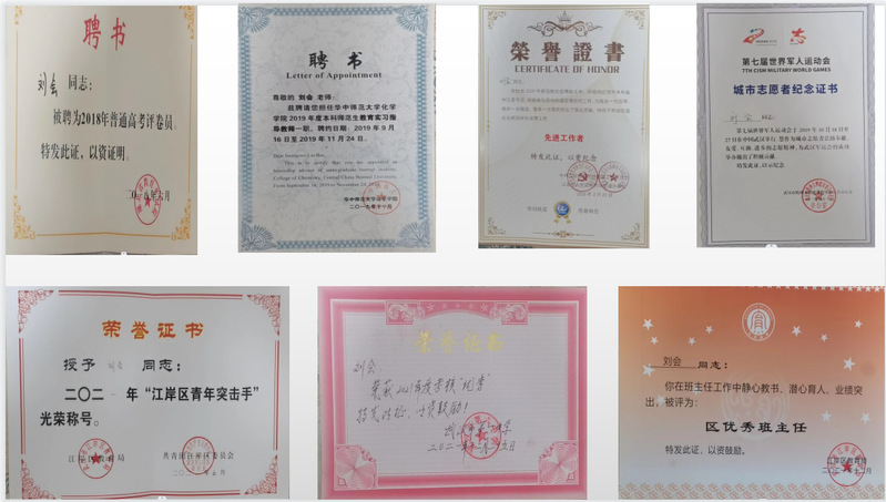 刘会在工作中脚踏实地,发掘工作中的不足,寻求解决思路,开拓创新,提升业务能力。她多次参与市级和区级等化学比武,向各学校优秀教师“取经”,解析自身在教学过程中存在的不足,并做到“三省吾身”,根据教学实践总结出自己的一套教学方法“严学风&细落实&宽生活”,并在带的三届学生中不断优化,取得了良好的教学成果。她始终坚持教学方法从学生中来,到学生中去,并在实践中做到“因材施教”。因此,在武汉市教学比武中获得二等奖,并获聘华中师范大学文学院实习指导老师。