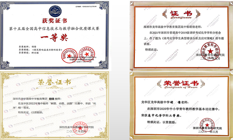2016年研究生毕业后,她就来到了深圳龙华这片教育热土,成为一名光荣的一线教师,开启了自己的教师生涯。乘着深圳教育改革发展的东风,驰骋在教育教学能力发展的快车道,锤炼心智,提升素养,7年的努力,胡倩逐渐成长为一名能够独当一面的青年教师。从教至今多次在市、区的教学技能大赛、青年教师基本功大赛、高考模拟命题大赛、创新实验设计大赛中获奖。2021年6月参与了广东省高考的阅卷工作,同年9月在深圳市普通高中2019级调研考试化学学科分析会上作了《高考化学学生典型错误分析及应对策略》的线上专题讲座,获得了一致好评。2021年11月承担了广东省普通高中新课程新教材实施示范区示范校建设交流研讨活动中展示课的上课任务,反响热烈。2022年4月在深圳市化学教研公众号“深化教研-圳学致远”公众号上发表了“微观机理图—宏微结合探变化”的专题讲座。2022年9月被评为龙华区“优秀教师”称号。