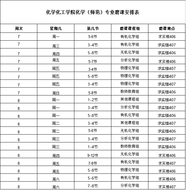 课堂是教育教学的第一阵地,课堂教学是师范专业认证专家重点考查的内容。为积极推进我院课堂教学改革,提升教师课堂教学能力,做好迎评工作,我院化学(师范)专业从第7周开始按课程组开展磨课活动。学院教学督导赵胜芳教授、资深教授朱立红和廖学红教师为此次活动的指导老师。