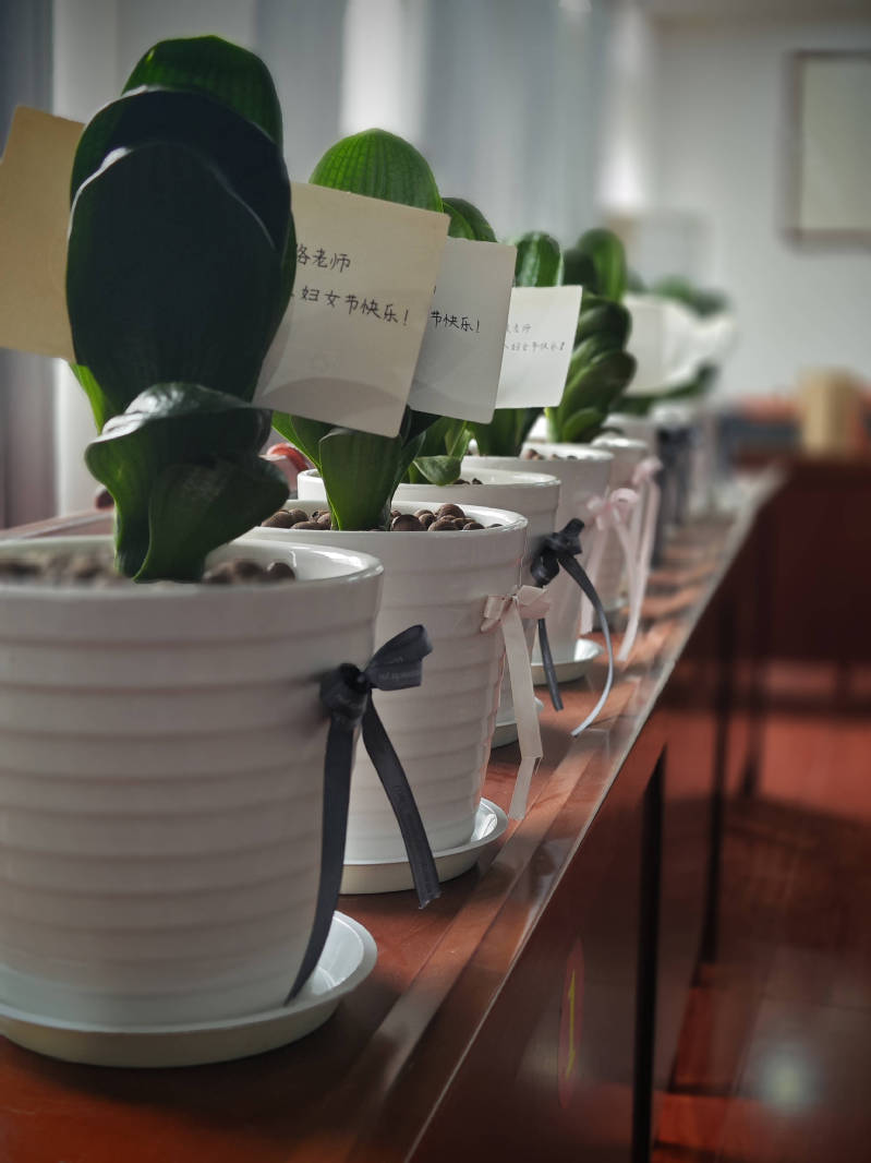 最后,学院领导依次为女教师们送上一份节日礼物一一绿植君子兰,祝福全体女教师们节日快乐!青春永驻!万事如意!