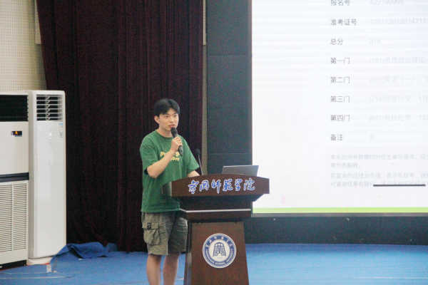 会议第一项,吴琴、林艳、许锦铧、陈英、黄纪超5位优秀考研学子上台分享了各自成功的考研经验和感悟。他们分别从复习计划、公共课复习技巧,网课视频,专业课复习、英语阅读讲述了自己的备考经验,同学们都纷纷记下学长学姐们的推荐。同时,优秀考研学子们还强调复习时的时间、节奏、心态非常重要,他们为备战考研的同学们提出了好的建议,认为只要坚持自己,相信自己就一定可以上岸成功,鼓励我院下届学生在未来备战考研的日子里能够不断地战胜自己,最终达到理想的彼岸。除此之外,两位分别来自武汉理工大学和华中农业大学的学姐还给发来了视频,分享了读研的生活,并祝福我院学生考研成功。