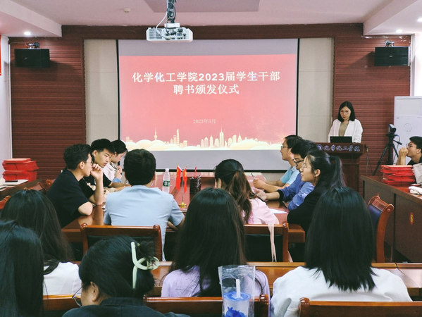 2023年5月24日,我院在化学楼407举行2023届学生干部聘书颁发仪式。院党委副书记龙刚老师、辅导员余杨、龚文朋老师,2023届全体学生干部共同参加本次会议。本次会议由余杨老师主持。