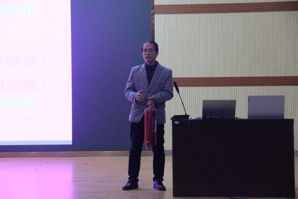 尹教官讲座的主题为《关注消防、生命至上》。他指出,国家消防是以“预防为主,防消结合”为宗旨。他结合近年来全国发生的火灾典型案例,条理清晰地从四个方面进行详细讲解:一是结合火灾发生的起因强调同学们提高消防安全意识的重要性;二是从同学们日常生活中暴露出的安全隐患指出加强学习消防知识的必要性;三是在火灾发生时自救逃生技能和火灾初期扑救的时机和方法;四是对不同种类的火灾使用不同灭火器材的方法及注意事项。同时,尹教官现场给同学们示范如何正确使用干粉灭火器。尹教官的消防知识讲座,事例详实,要点突出,深深的吸引的在场的学生,让同学们意识到消防安全要从身边的小事做起,才能防范于未然。