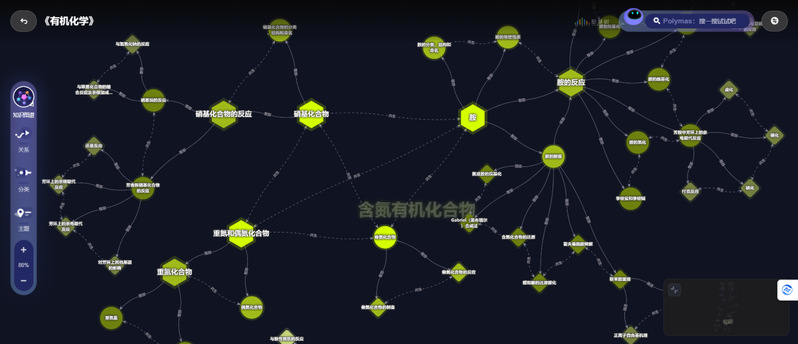 《有机化学》知识图谱直观、清晰地呈现知识点的重要程度、知识点之间的联系、知识点的自动聚类等,以“知识地图”的形式直观地呈现了整个学科的知识结构和分布,从而学生可以在“知识地图”上进行知识搜索、学习导航等,能培养助力于学生自主学习能力的养成。
