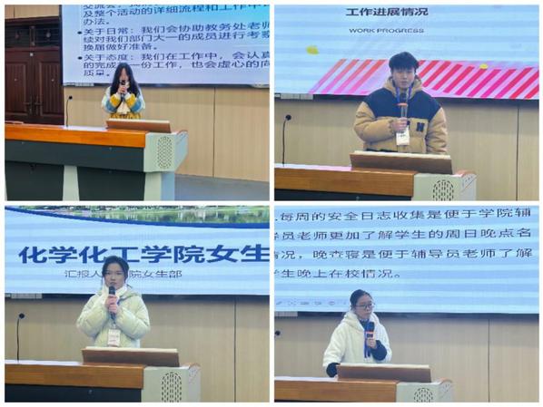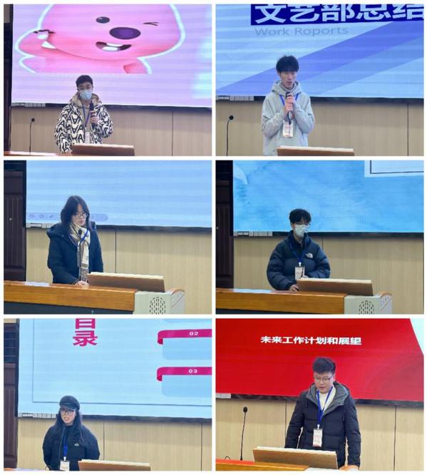 随后,学生会主席团代表和分团委代表就各部门工作情况作总结发言。“携手勇担新使命,引航奋进新征程”,学生会工作要深入贯彻落实党的二十大精神、团的十九大精神及学校第三次党代会精神。希望在新的一年,各部长干事能够汲取上一年工作的不足,凝聚各部门力量共同成长,团结合作,互帮互助,用笃行不怠的态度和不畏困难的精神,认真细致地完成每一项工作及接受新的挑战。