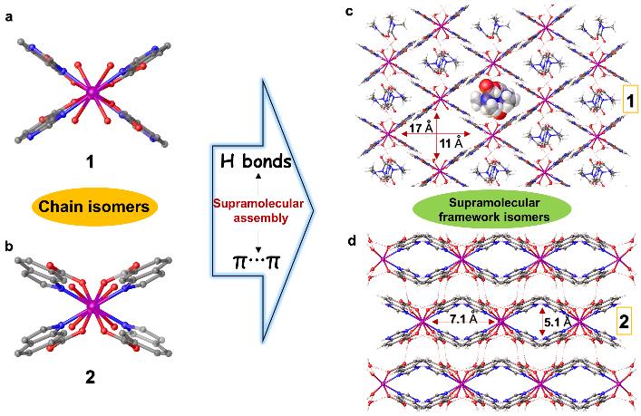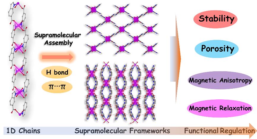 金属氢键有机框架材料(MetaloHydrogen-bonded organic frameworks, MHOFs)是一类新兴的多孔超分子框架材料,由含有金属的次级结构单元和有机配体通过氢键作用自主装构成,在质子超导、气体分离、荧光传感、分子磁性等领域具有广泛的应用前景。由于其具有较高的比表面积、多孔性、低密度和结构可调控等优势,兼备了金属有机骨架(MOFs)和共价有机骨架(COFs)两类多孔晶体材料的优点,近年来已引起院世界各地科学家们的广泛关注。我校邵东博士团队通过设计合成一种一维钴链,通过超分子弱作用和超分子异构现象,构筑了两种孔隙性、磁性、稳定性不同的超分子异构体MHOFs。这些发现不仅表明MHOF材料的结构和稳定性、孔隙度和磁性可以通过超分子异构化方法进行有效调节,还为磁性调控研究领城提供了新的方向和思路。