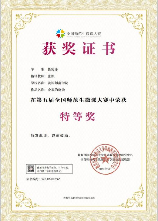 一直以来,我院高度重视对化学类学生专业技能的培养和提升,在比赛来临之初,学院积极组织预赛,积极组建由经验丰富的学科教学领域专家组成的教师指导团队,层层遴选、优中选优,培养选拔参赛选手参加比赛。在成功闯入决赛后,在我院优秀指导老师张凯的带领下,白天黑夜、全程无休,组织开展了多轮次的教学指导与训练。最终成功入围全国决赛,在华东师范大学、华中师范大学、东北师范大学等“双一流”名校选派出的高手如云的情况下,我院伍霞菲同学凭借微课中优异的表现,力压群雄,不负众望,斩获殊荣充分展现了我院师生扎实的教学基本功和良好的精神风貌。