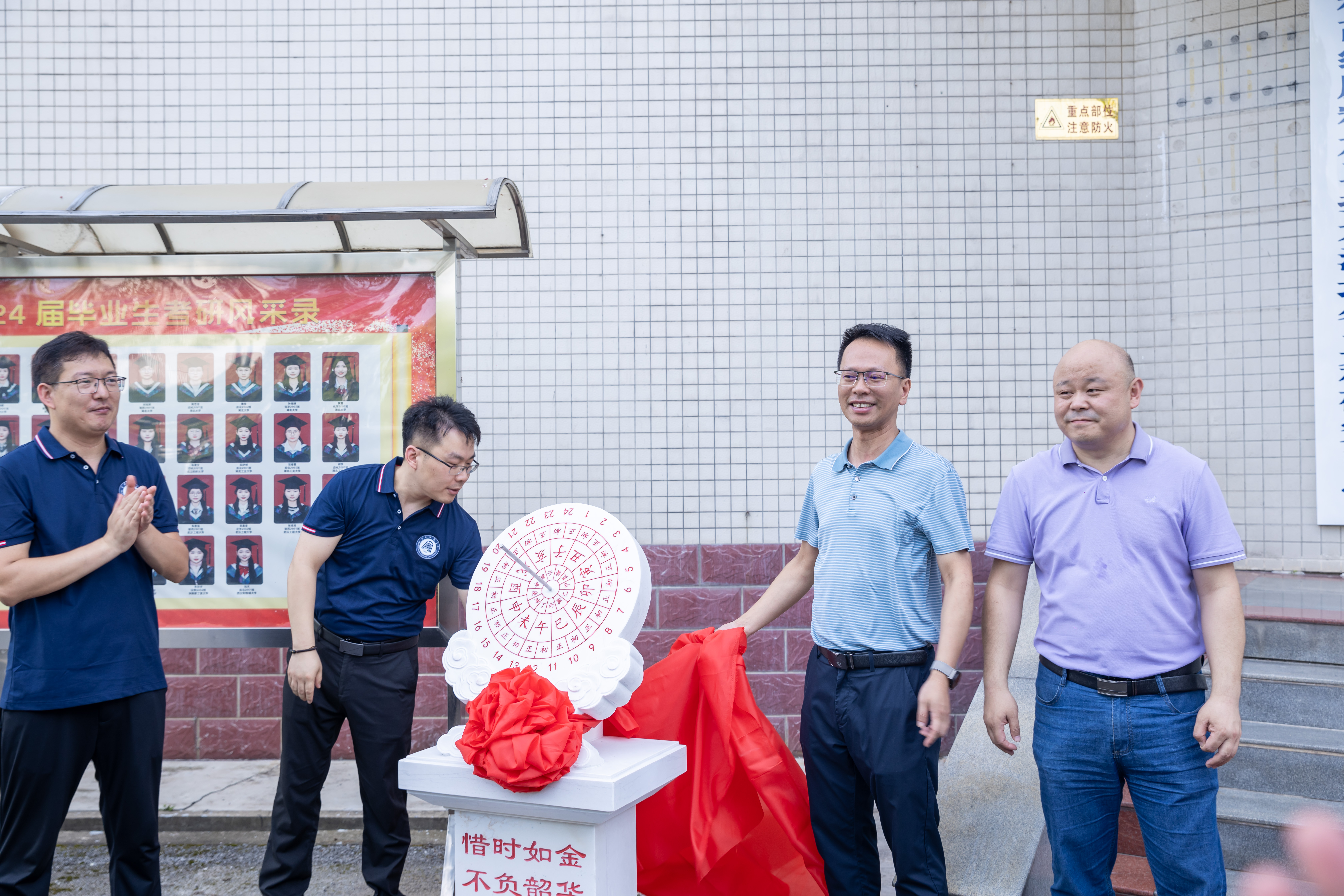 随后,校友一行代表与学院领导在化学楼门口,举行了捐赠仪式。学院党委书记邱浩、院长田正芳代表学院接受化学200402班校友给学院捐赠的日晷雕像并合影留念。