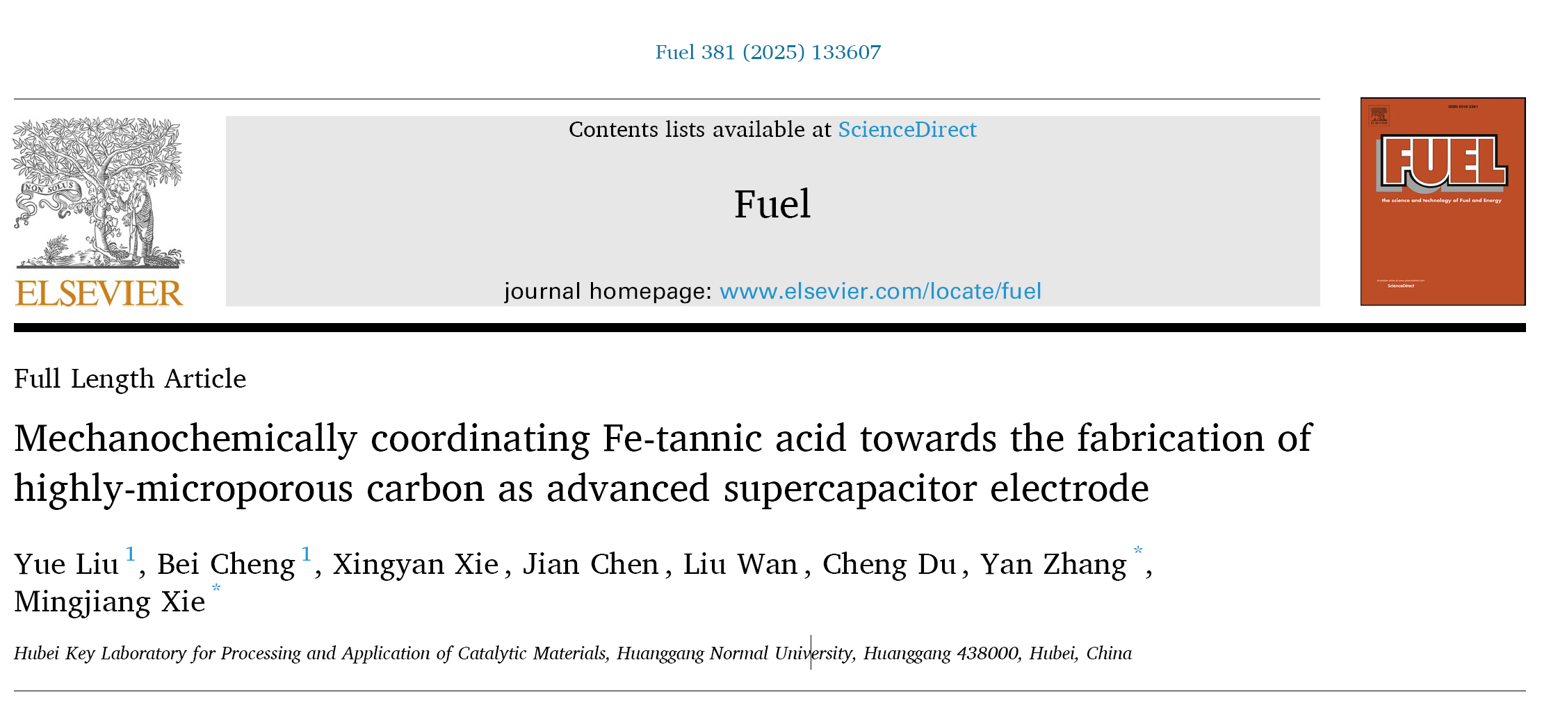 2024年11月11日,老牌能源化学领域权威期刊《Fuel》在线报道了我院炭基能源催化材料团队的最新研究成果“Mechanochemically coordinating Fe-tannic acid towards the fabrication of highly-microporous carbon as advanced supercapacitor electrode”。我院应化2021级本科生刘悦和化学2021级程贝为论文共同第一作者,化学2023级谢星艳为论文第二作者,张燕博士和解明江教授为论文共同通讯作者。威廉中国官方为论文唯一通讯单位,团队的其他老师参与了本工作的研究。Fuel是Elsevier(艾斯维尔)出版社旗下收录能源化学领域相关研究成果的顶级期刊,中科院SCI工程技术类一区Top期刊,威廉中国官方成果分类A1期刊。