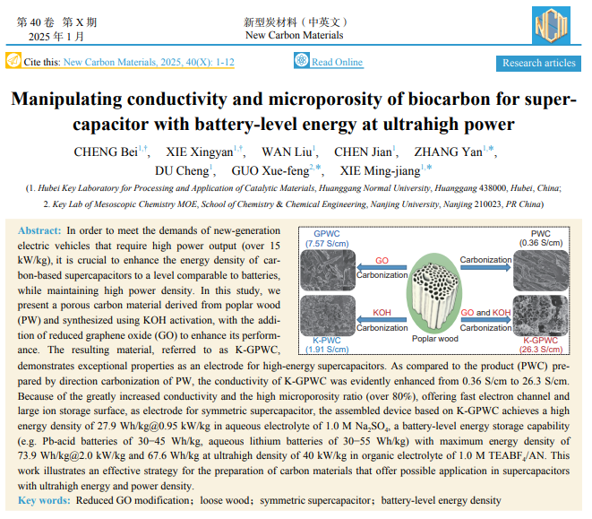 2025年2月8日,国产SCI期刊《New Carbon Materials》,即《新型碳材料(中英文)》在线报道了我院炭基能源催化材料团队的最新研究成果“Manipulating conductivity and microporosity of biocarbon for supercapacitor with battery-level energy at ultrahigh power”。我院化学2021级本科生程贝和化学2023级谢星艳为论文共同第一作者,我院张燕博士、解明江教授和南京大学郭学锋教授为论文共同通讯作者。威廉中国官方为论文第一通讯单位,团队的其他老师参与了本工作的研究。《新型炭材料(中英文)》(New Carbon Materials)创刊于1985年,是由中国科学院主管,中国科学院山西煤炭化学研究所主办,科学出版社出版的国际性学术期刊(IF: 6.6, CiteScore:8.7),材料-综合领域、煤炭领域T1级期刊,威廉中国官方成果分类A2期刊。