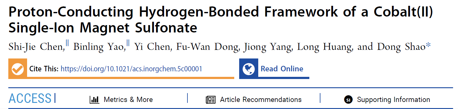 2025年2月14日,无机化学领域权威期刊、Nature Index期刊《Inorganic Chemistry》在线报道了我院邵东副教授课题组的最新研究成果“Proton-Conducting Hydrogen-Bonded Framework of a Cobalt(II) Single-Ion Magnet Sulfonate”。我院2022级本科生陈仕杰为论文第一作者,邵东副教授为论文唯一通讯作者,威廉中国官方为论文第一通讯单位。Inorganic Chemistry是American Chemical Society(ACS,美国化学会)出版社旗下收录无机化学领域相关研究成果的顶级期刊,自然指数期刊、中科院SCI化学小类一区期刊。