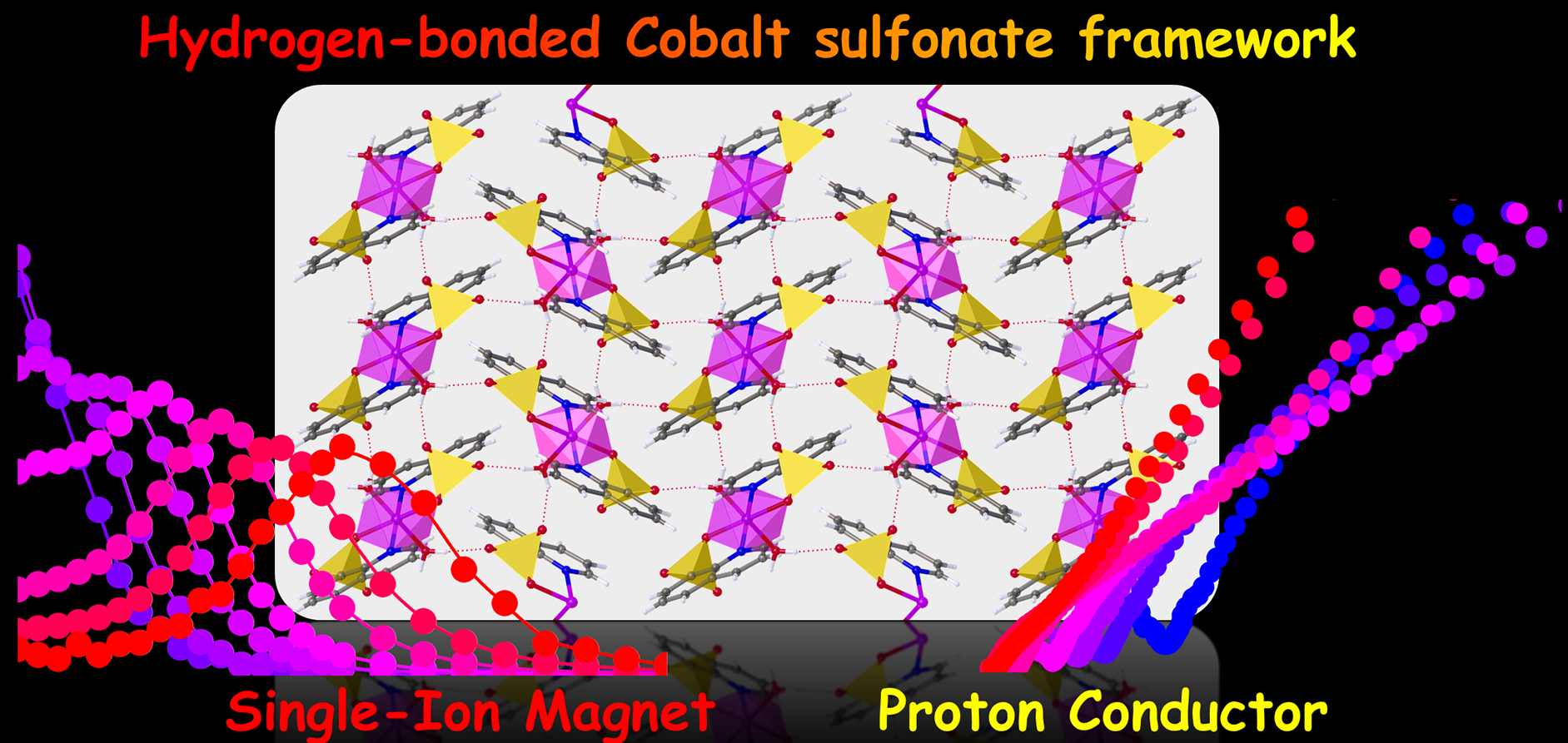 抗磁性金属磺酸盐已被广泛报道,而顺磁性金属磺酸盐配合物则非常罕见,尤其是能展现出有趣的磁性或质子传导性能的化合物。此外,金属氢键有机框架材料(Metalo Hydrogen-bonded organic frameworks, MHOFs)是一类新兴的多孔超分子框架材料,近年来已引起世界各地科学家们的广泛关注。近年来,邵东副教授团队围绕功能有机磺酸配合物和MHOF材料的构筑和功能化开展工作,取得系列进展(Inorg. Chem. Front., 2022, 9, 6147-6157; Inorg. Chem. 2022, 61, 3754−3762;Inorg. Chem. 2024, 63, 17478−17487.)。基于前面的研究成果,邵东团队通过利用一种喹啉磺酸有机配体与钴盐反应,制备出罕见的磺酸氧配位的单核顺磁性金属磺酸盐配合物,这些配合物单元进一步通过氢键相互作用组装成氢键框架结构。变温单晶和变温粉末衍射实验证实该化合物具有较高的热稳定性。磁性和电化学测量表明这些材料呈现出单离子磁体和质子导体特征。在文章中,团队提出“磁各向异性金属离子-有机磺酸-配位水”三位一体的构建策略,实现多功能MHOF材料的合成制备。该结果不仅报道了首例双功能磁-电顺磁性金属磺酸盐配合物,还为设计合成金属氢键有机框架材料提供了新的构筑策略。