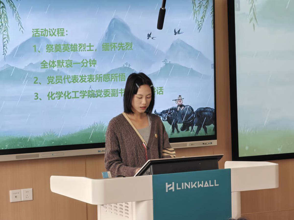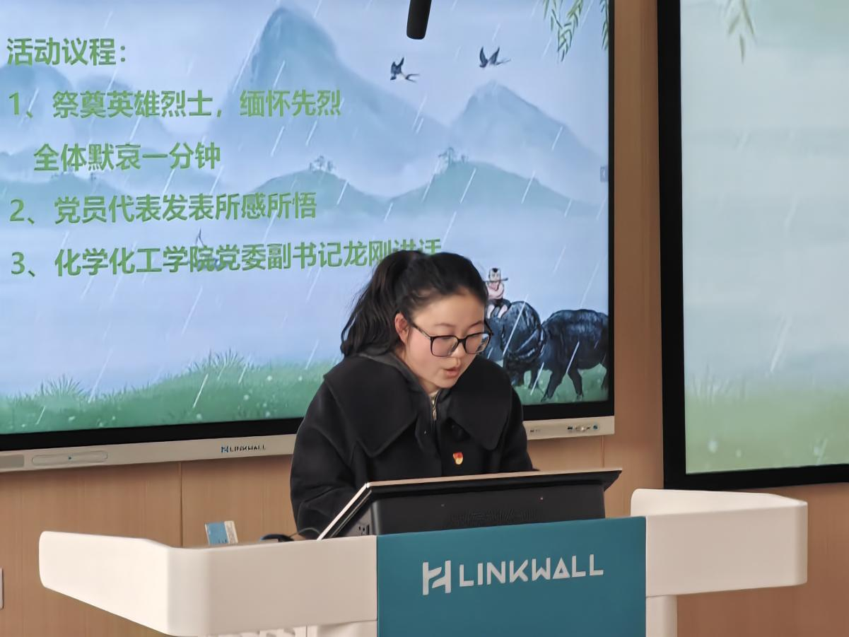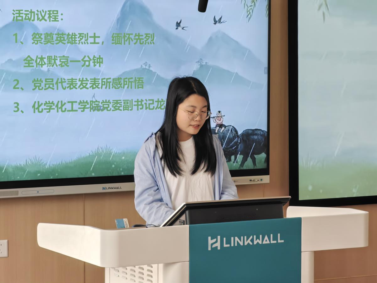 会议第二项,研究生党支部严梦琪、学生第一党支部冯可、学生第二党支部王羽琪分别发言。他们牺牲时的年龄,比我们现在还要小......研究生党支部严梦琪的讲述让历史变得可触可感。当她展示杨靖宇将军胃中仅存的棉絮、赵一曼烈士留给幼子的绝笔信时,不少同学潸然泪下。学生党员冯可通过一组对比数据,展现了当代青年与革命先烈在不同时空下的使命传承。王羽琪强调,作为新时代青年,我们要传承英烈遗志。英烈们虽已远去,但他们的精神如明灯,照亮我们前行道路。我们应从他们身上汲取力量,将爱国之情、报国之志融入日常学习与生活,在新时代的浪潮中奋勇前行。