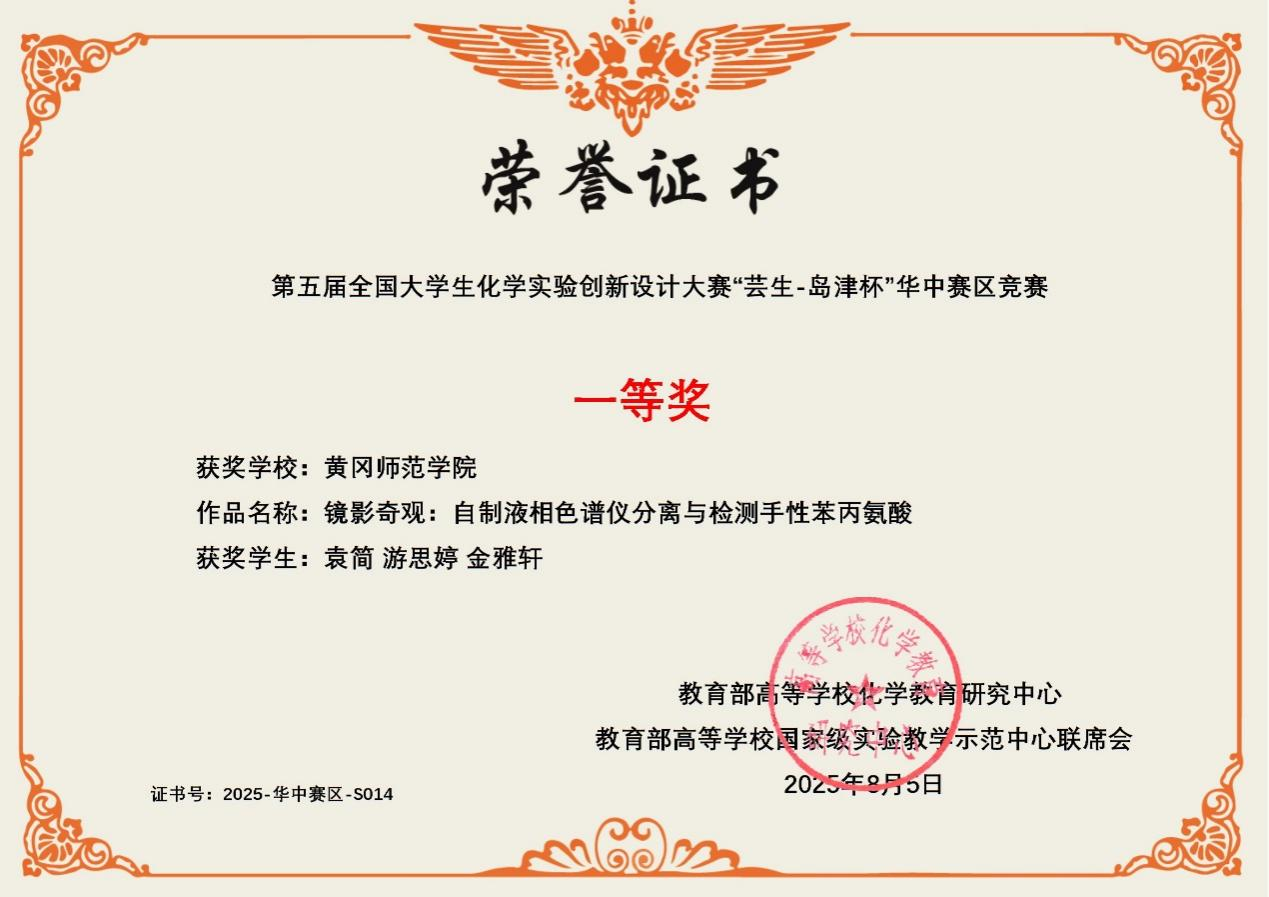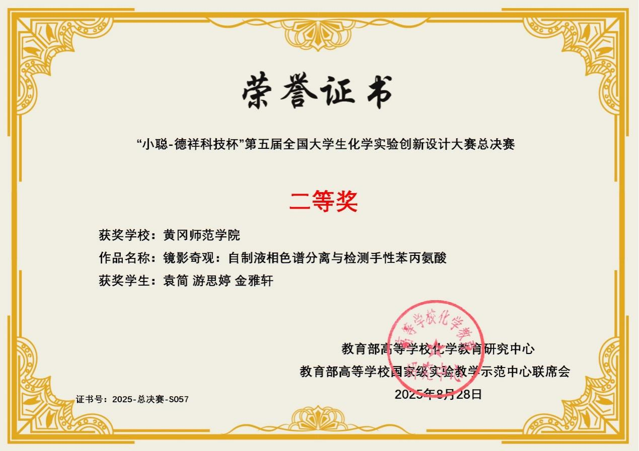 2025年8月21-24日,第五届全国大学生化学实验创新设计大赛总决赛在兰州大学落下帷幕。WilliamHill威廉制药工程专业2023级本科生袁简、游思婷、金雅轩组成团队,在张龑、杨一思老师指导下,凭借扎实的专业功底与创新实践能力,一路披荆斩棘,以华中赛区一等奖的身份获得参加全国总决赛的资格,并在全国总决赛中荣获二等奖。