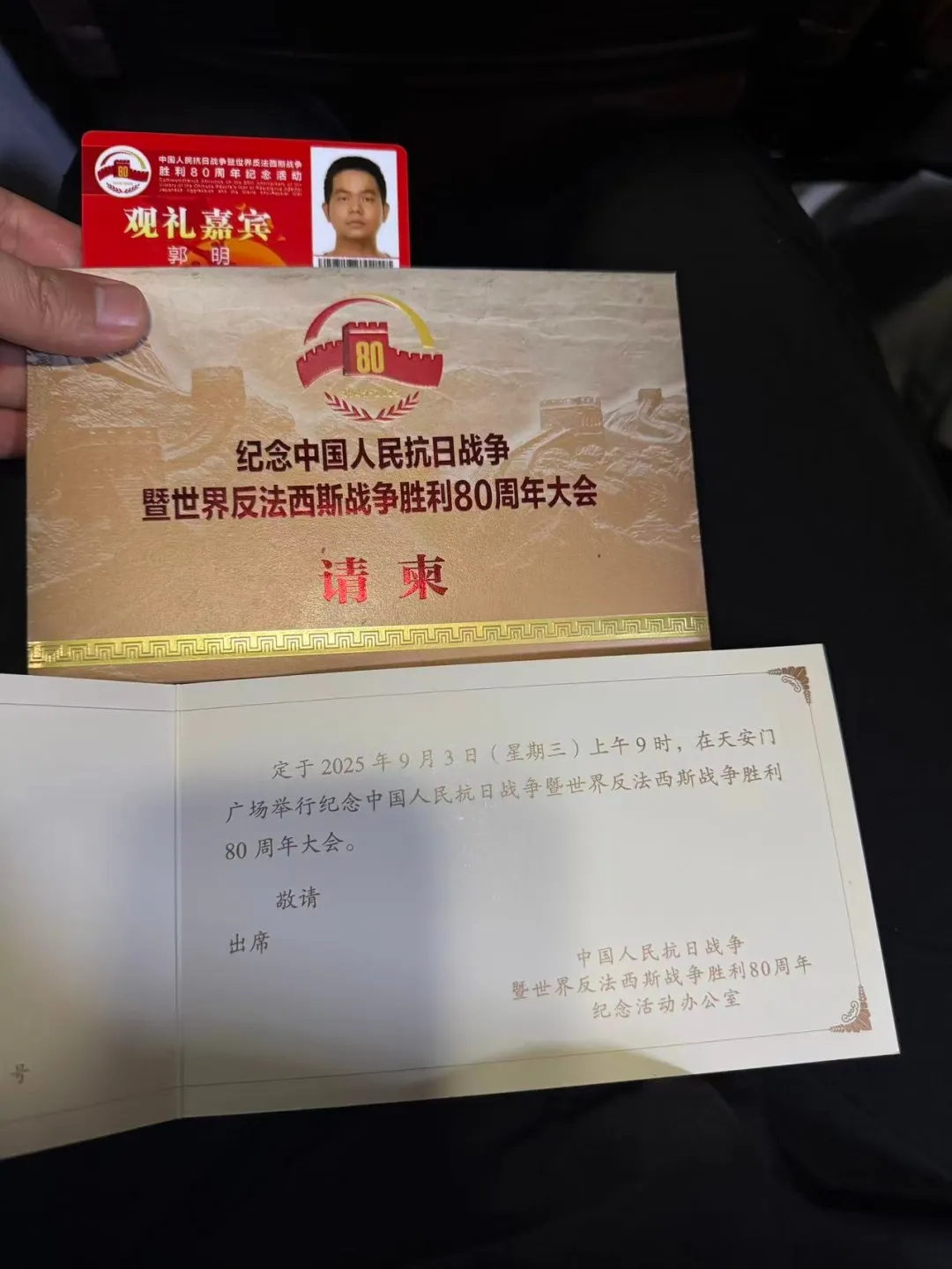 9月3日上午,纪念中国人民抗日战争暨世界反法西斯战争胜利80周年大会在北京天安门广场隆重举行。我校优秀校友郭明受邀现场观礼。