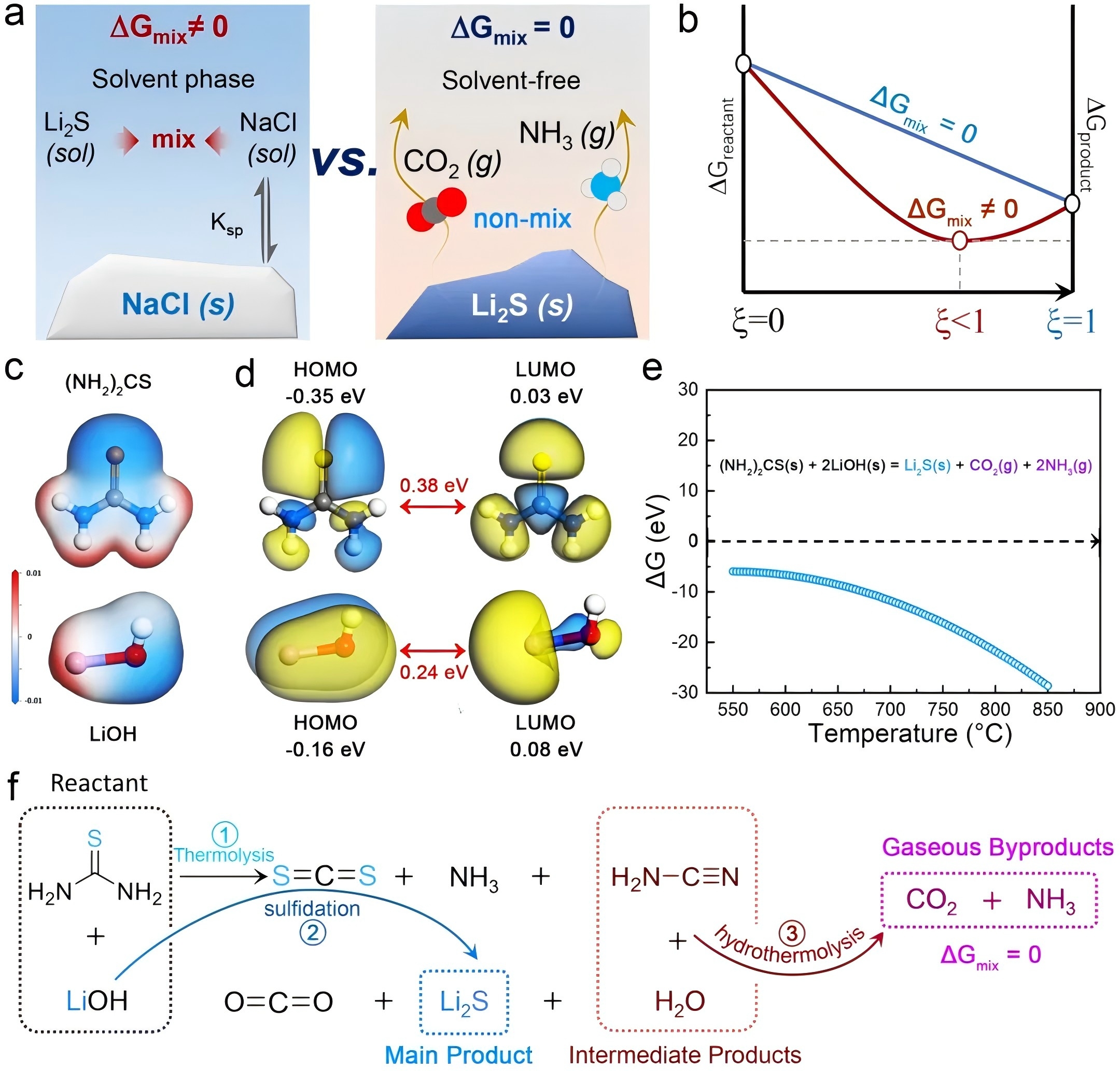 该研究成果提出了一种无溶剂复分解反应(metathesis)法,利用廉价、安全的硫脲(thiourea)作为S2⁻供体与LiOH反应,在无溶剂体系下直接生成高纯              sLi2S, 并伴随CO2与NH3气体自发逸出,从而避免了传统液相法中ΔGmix引起的平衡限制,实现反应完全转化与高纯产物获得。