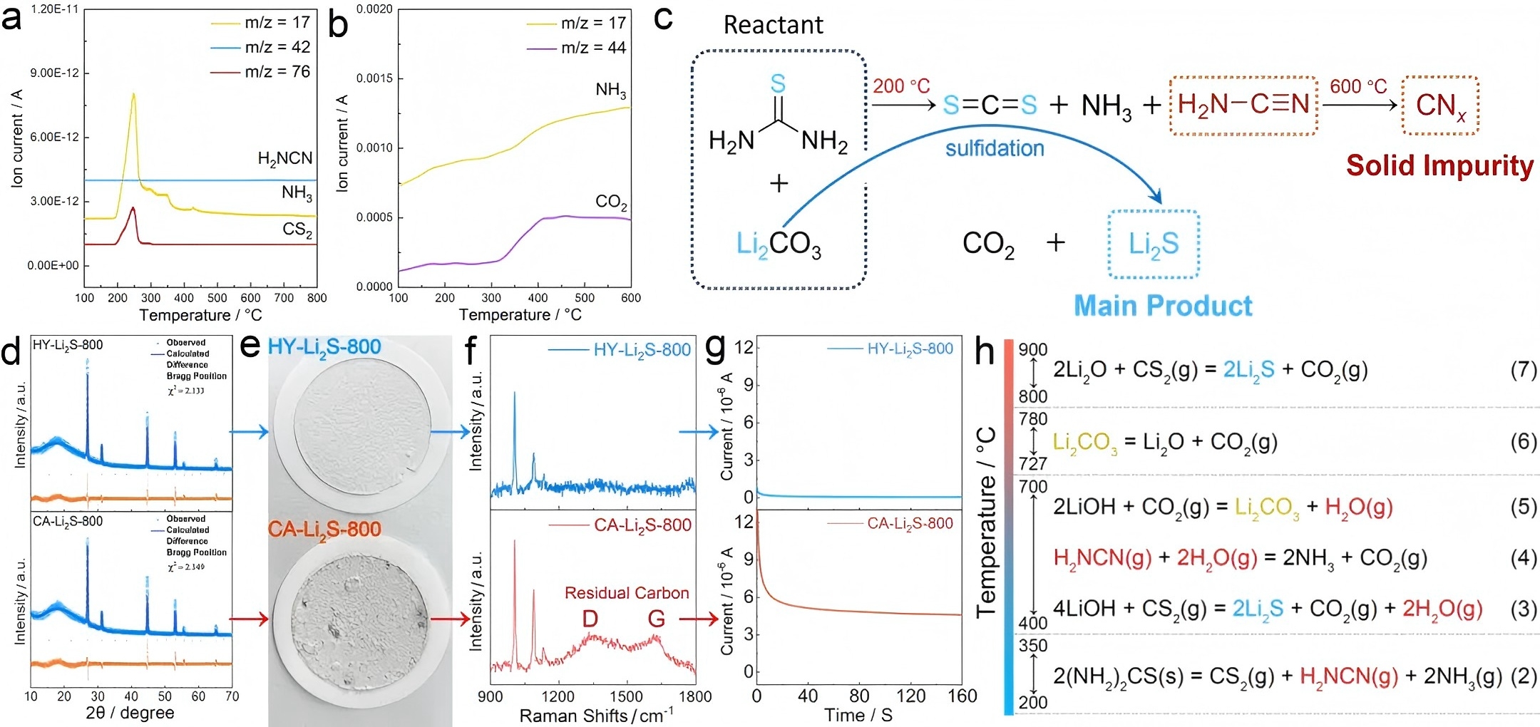 该成果首次实现了以固体硫脲为硫源的无溶剂绿色合成路线,突破了传统液相体系中产物转化不完全与纯化成本高的问题,为高纯Li2S的大规模、低成本生产提供了切实可行的 新思路。