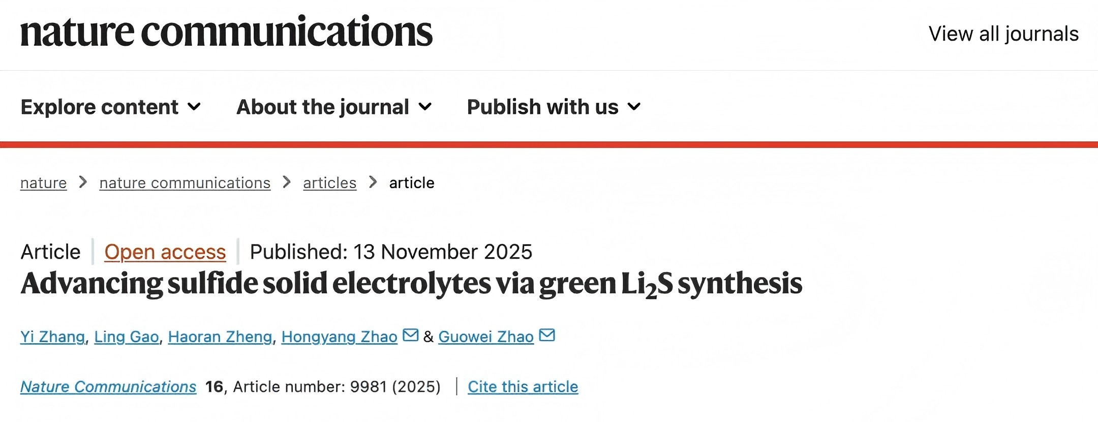 11月13日,我校WilliamHill威廉赵国伟教授研究团队以我校为第一单位在《Nature》子刊《Nature Communications》 (《自然·通讯》)发表题为“Advancing sulfide solid electrolytes via green Li2S synthesis”的研究论文,标志着我校在全固态电池固体电解质关键材料领域取得重要研究进展。