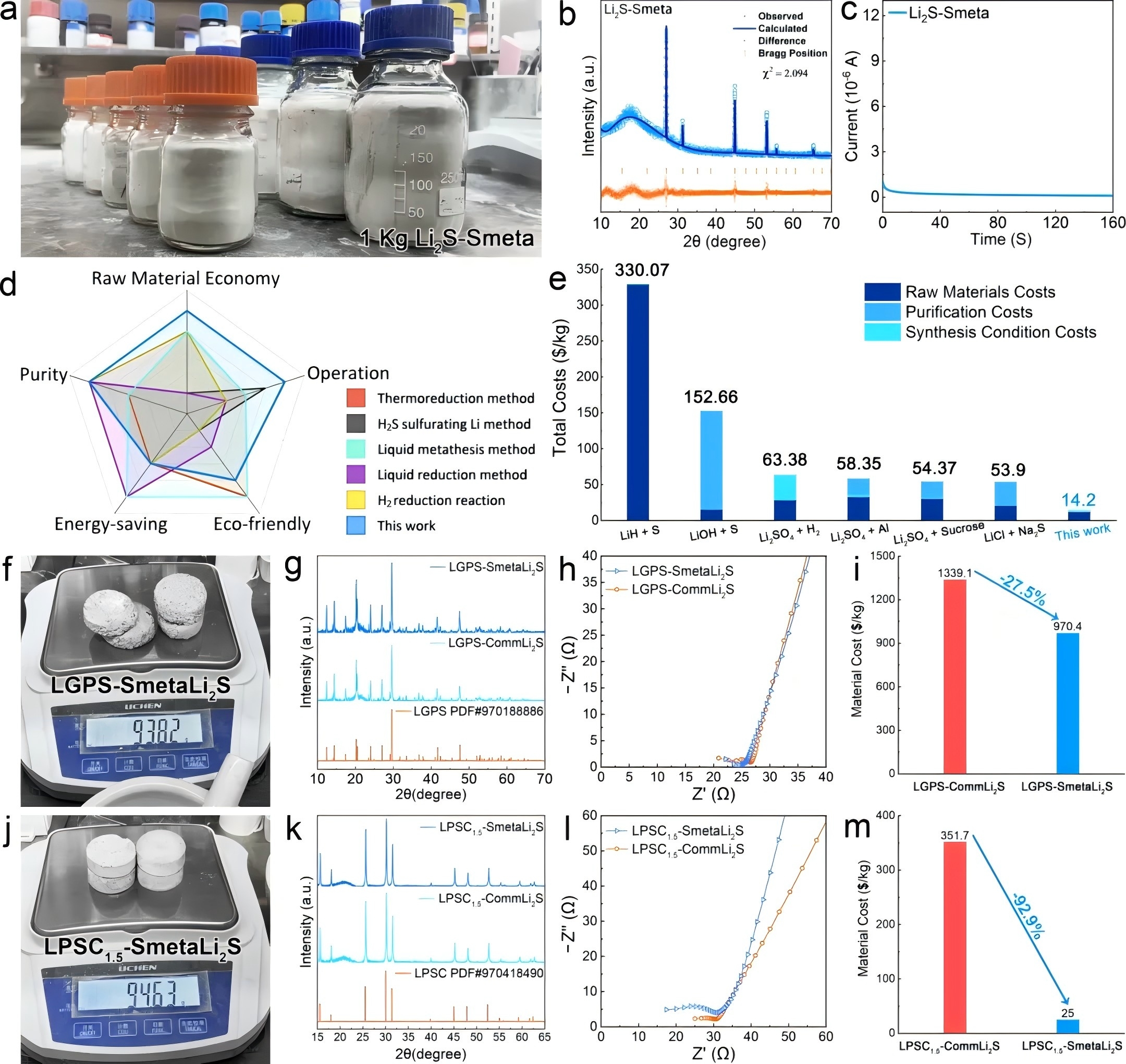 该研究成果提出了一种无溶剂复分解反应(metathesis)法,利用廉价、安全的硫脲(thiourea)作为S2⁻供体与LiOH反应,在无溶剂体系下直接生成高纯 sLi2S, 并伴随CO2与NH3气体自发逸出,从而避免了传统液相法中ΔGmix引起的平衡限制,实现反应完全转化与高纯产物获得。